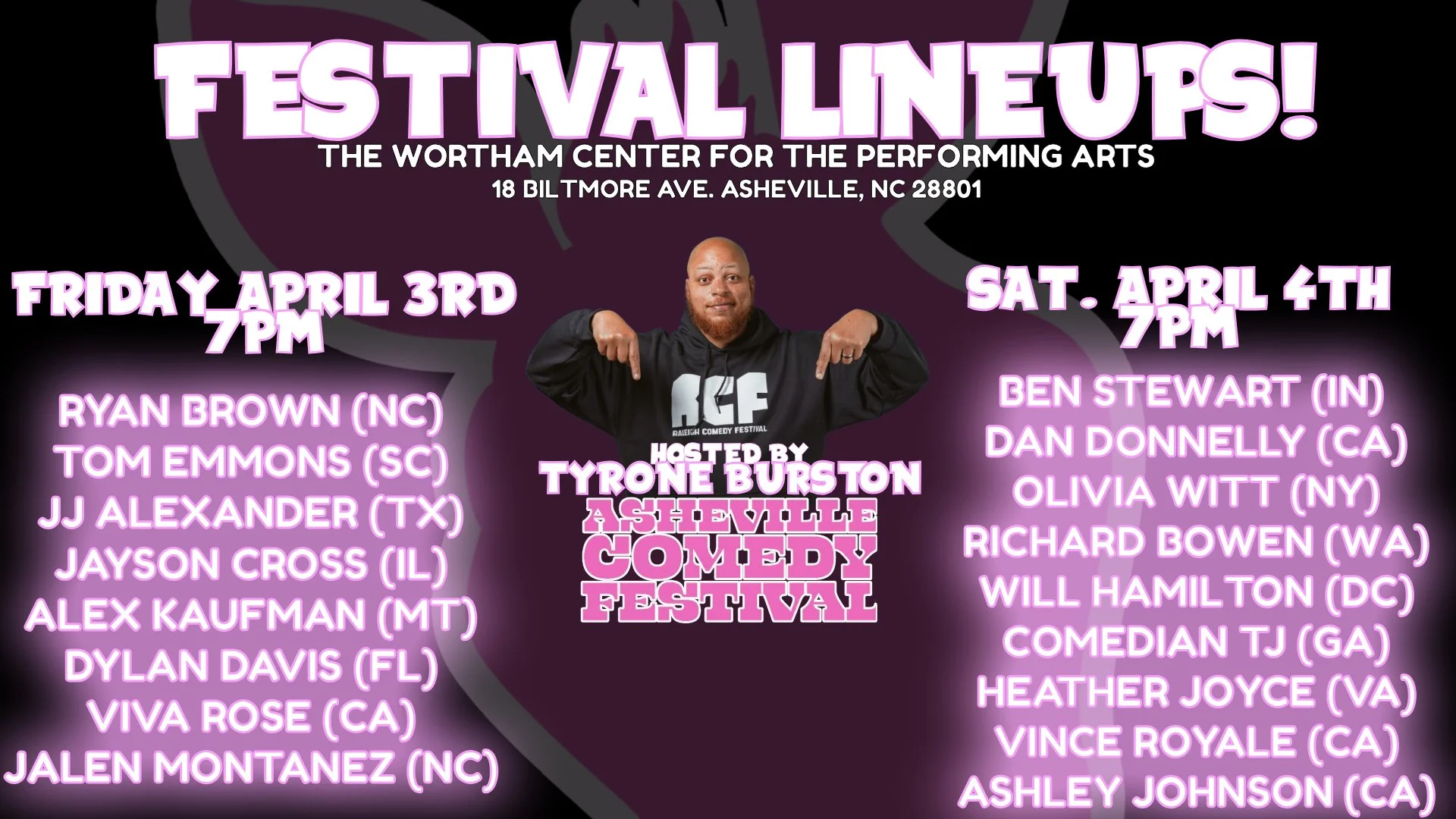 The Asheville Comedy Festival is one of the longest-running comedy events in the country. Having featured nearly 700 comedians over 17 years, the event continues to grow and innovate. The festival is regarded as one of the most talent and comedy industry-friendly festivals year after year having supported most of the household names you know today. Roaring into its 18th year (season!) taking over the city of Asheville April 3-4 for the Springtime invasion event featuring 18 of the nations fastest rising stars of comedy..